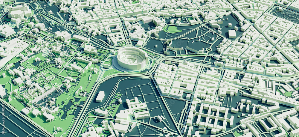 3D render map of the Rome cityscape. 3D illustration of an aerial view of Rome, Italy. #1961912099