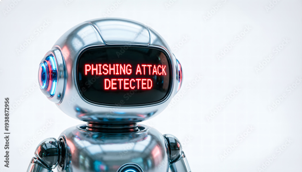 3D render of a cute AI robot alertly displaying "PHISHING ATTACK DETECTED" on its screen, isolated on white. #1938872956