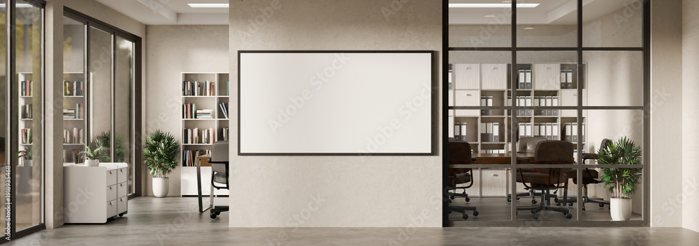 3D rendered Office interior with blank wall frame and meeting room, Minimal corporate workspace with empty poster mockup #1918935468