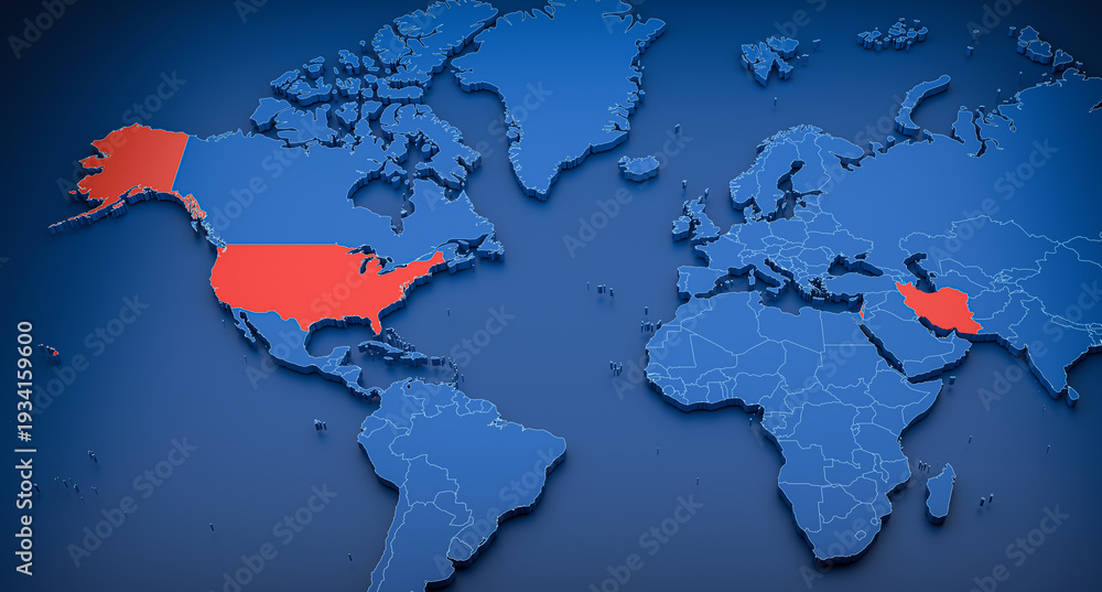 3D rendering of a map showing the positions of Israel, the United States, and Iran. A map showing the conflict between Israel, the United States, and Iran. #1934159600