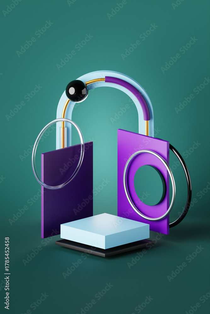 3D rendering of a modern podium surrounded by abstract geometric shapes. Minimalist background with smooth surfaces, soft lighting, and balanced composition #1785452458