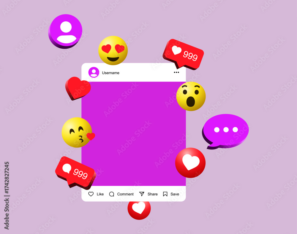 3D social media post frame with notification icons, floating emojis ( love emoji, kissing face, wow reaction ) and 3d like icon button, speech bubble 3d icon. for digital marketing concepts or mockups #1742827245