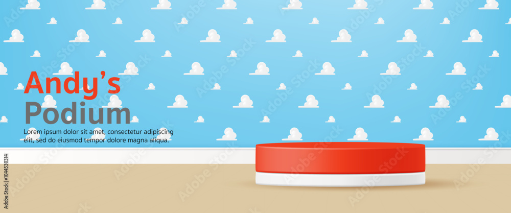3D Vector kid toy display geometric stand podium banner, White Clouds on Blue Sky Background with wood floor for baby store, online shop, movie poster, story, sales promotion, social media, web, post #1044530314