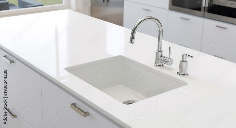 3D visualization of a pristine white kitchen countertop with integrated basin and sleek hardware #1938244238