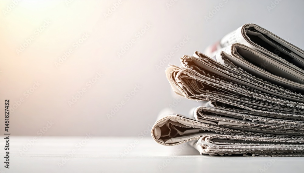 Daily News Stack: A close-up shot reveals a stack of folded newspapers, their pages hinting at the day's events, resting on a sleek surface, a beacon of current affairs. #1451827432