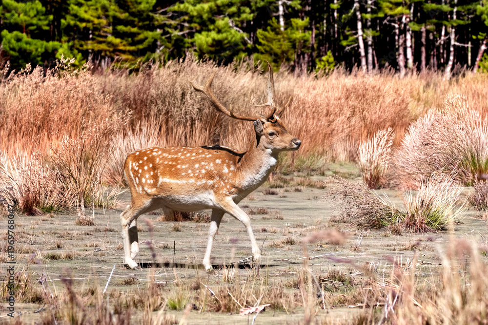 Daim de profil en lisière de grandes herbes sèches #1969768047