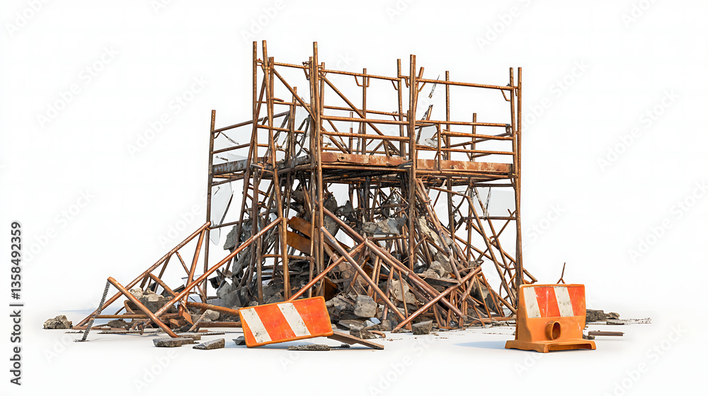 Damaged Scaffolding Structure with Orange and White Safety Barriers on White Background #1358492359