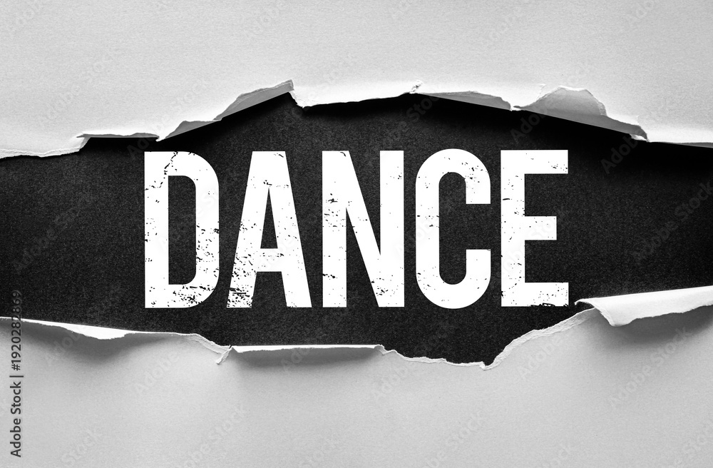 DANCE text in bold distressed font, revealed through a torn paper design. Energetic visual concept for performing arts, celebration, motion, rhythm, music, passion, and expressive movement #1920282869