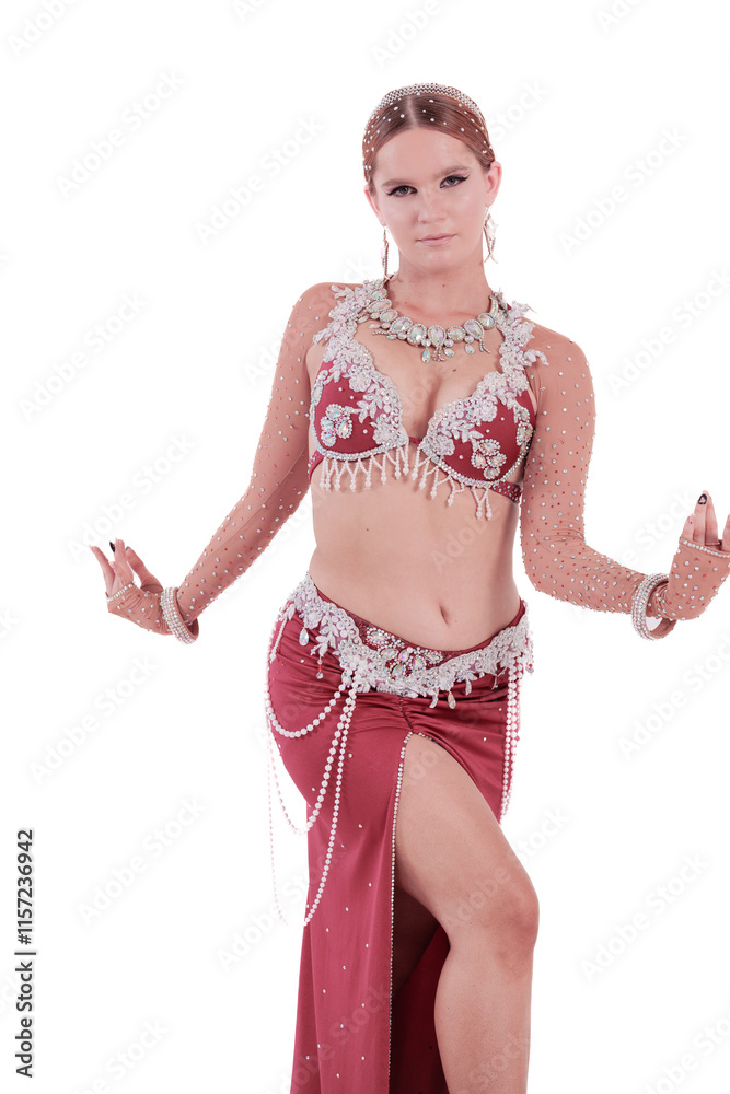 Dancer in red oriental costumes dance belly dance on the white background #1157236942