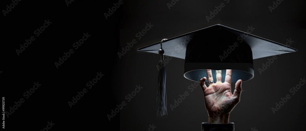 Dark and understated photo of a hand and graduation cap illuminated by bright blue light, a dramatic achievement concept, suitable for editorial and commercial use. #1919257311