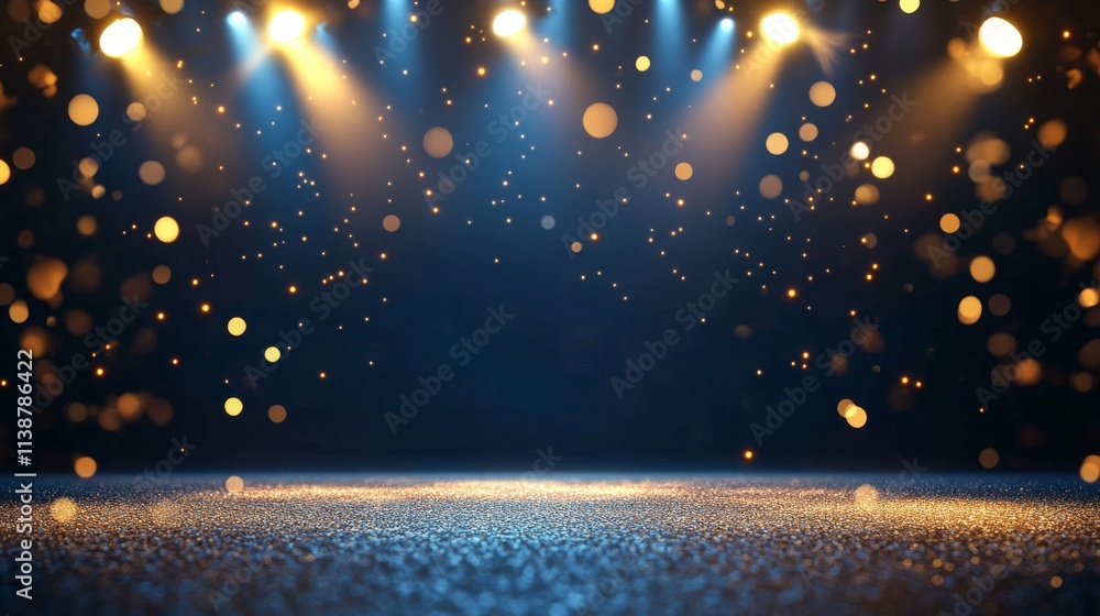 Dark blue stage with golden spotlight lines and glitter texture for award ceremony design. Realistic 3d abstract premium elegant glamour background template for anniversary or winner rewarding. #1138786422