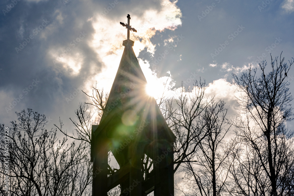 dark clouds are gathering and cover the sun which is just shining above a church tower with a cross #425737223