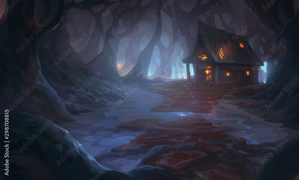 • #298708815 Dark forest, burning house illustration background cover