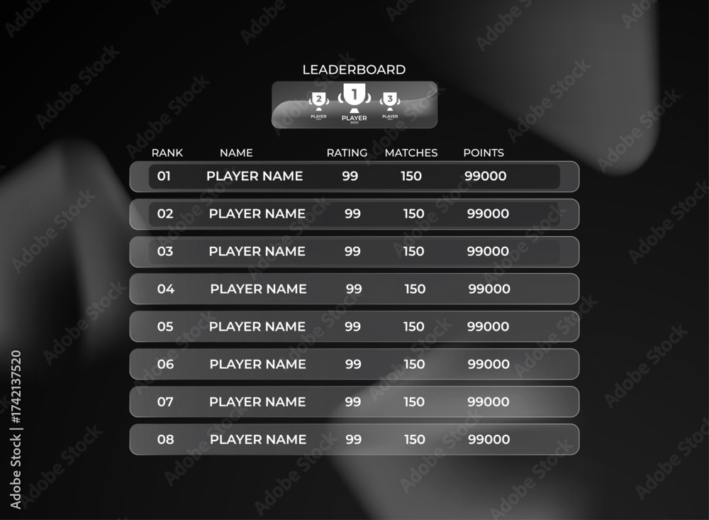 Dark glassmorphism leaderboard user interface. Modern scoreboard panel with rating, matches, and points for mobile and pc game ui. Clean minimal futuristic design template for competition results #1742137520