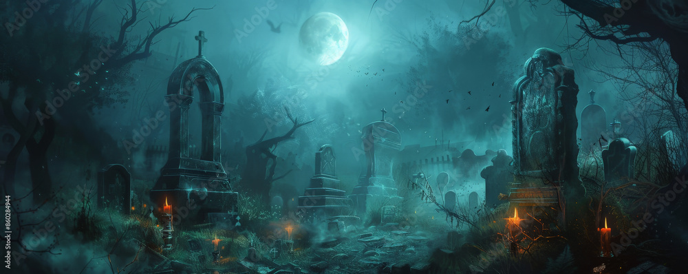 Dark Gothic fantasy background showcasing a moonlit cemetery with ancient, weathered tombstones and flickering candlelight. The atmosphere is thick with the presence of spirits and the unknown. #860284944