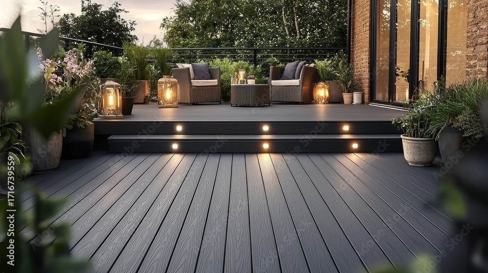 Dark Grey Composite Decking Design Evening Ambiance, Outdoor Patio, Luxury Landscape, , outdoor lighting, composite decking #1716739559
