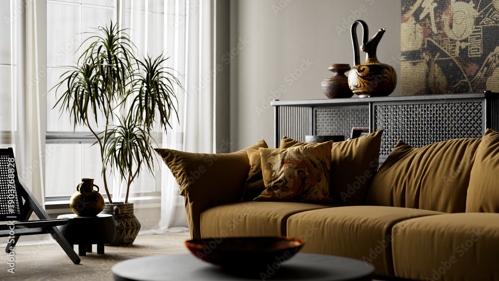 Dark moody japandi interior featuring bold contrast, natural textures and refined modern furniture arranged in a calm yet luxurious living composition. 3D illustration #1903768828