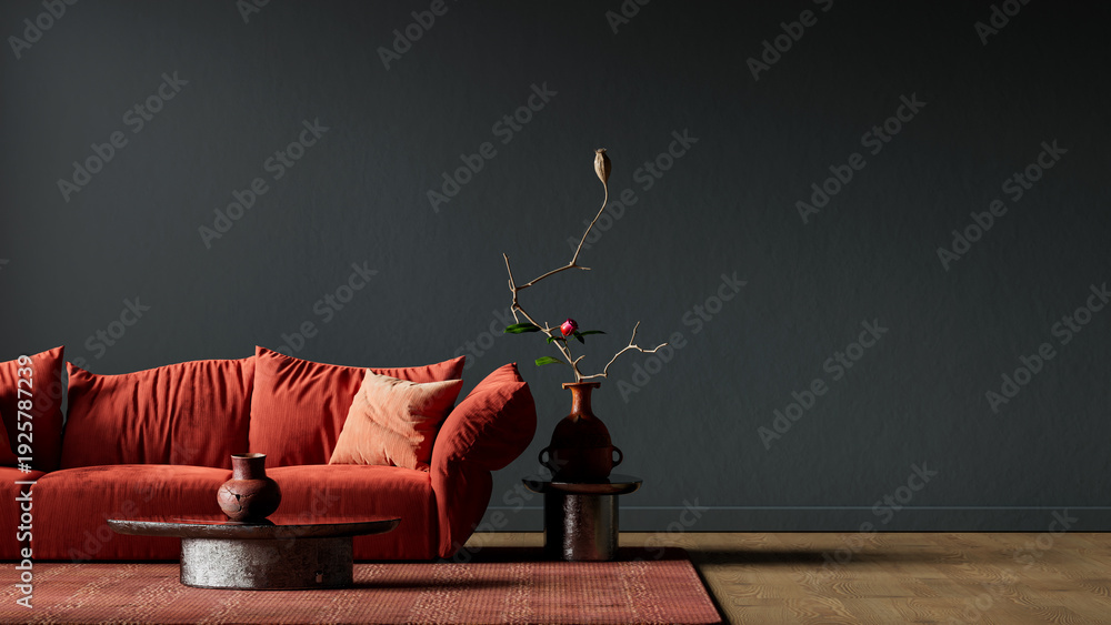 Dark moody negative space modern living room interior with curved red sofa, warm ambient lighting and elegant calm atmosphere creating refined contemporary styling. 3D illustration #1925787239