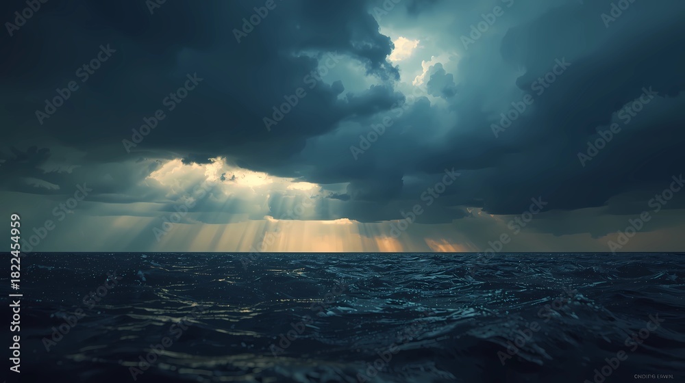 Dark ocean under heavy storm clouds pierced by light beams #1822454959