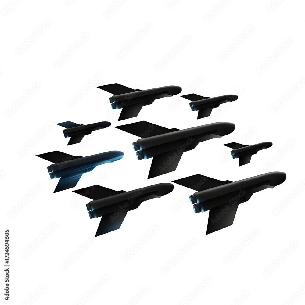 Dark Stealth Fighter Squadron: Futuristic Aircraft Formation, Dramatic Night Flight, Sci-Fi Illustration. #1724594605