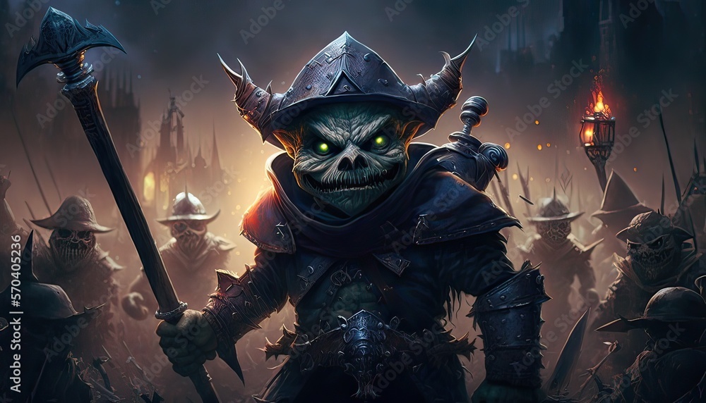 Dark wizard terrorizes kingdom with army of goblins. Illustration fantasy by generative IA #570405236