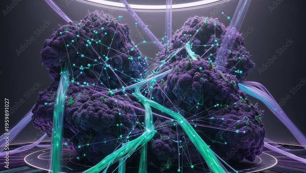 Darstellung eines Netzwerkes mit leuchtenden Linien, Kreisen und Punkten #1959891027