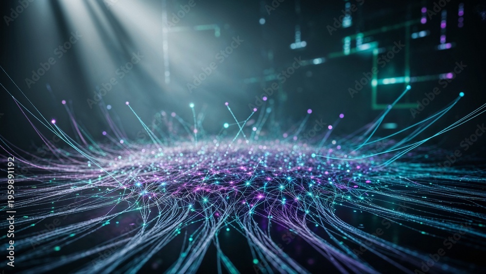 Darstellung eines Netzwerkes mit leuchtenden Linien, Kreisen und Punkten #1959891192