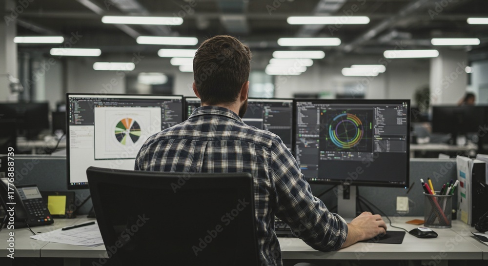 Data analyst working at a computer with multiple screens displaying complex charts and data visualization. #1776888739