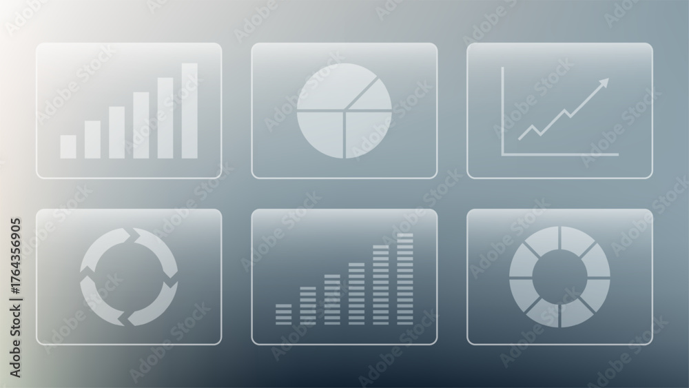 data analytics dashboard design with frosted glass panels showing chart icons bar graph pie chart line graph and business process symbols on gradient background for corporate presentation #1764356905