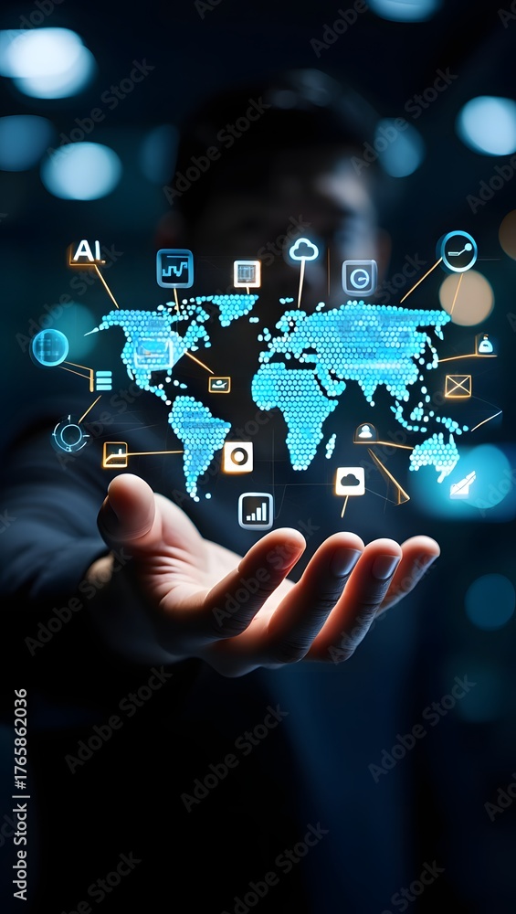 Data anlytics, AI and database management technology with global internet network connection. Connecting with cloud server and data center, technology background. data science and engineering #1765862036