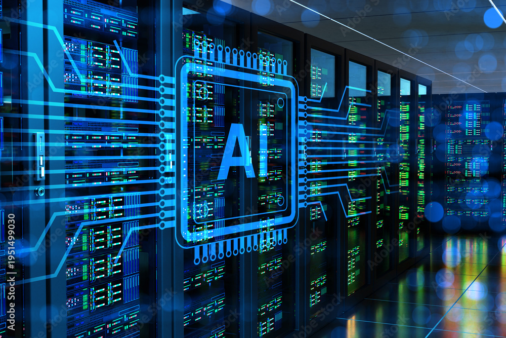 Data center, artificial intelligence computing. Server racks process AI workloads in high performance facility, managing big data, cloud services and machine learning operations. #1951499030