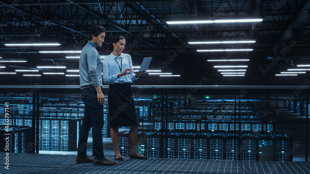 Data Center Female System Administrator and Male IT Specialist Talk, Use Laptop Computer. Information Technology Engineers work on Cyber Security Network Protection in Cloud Computing Server Farm. #460797141