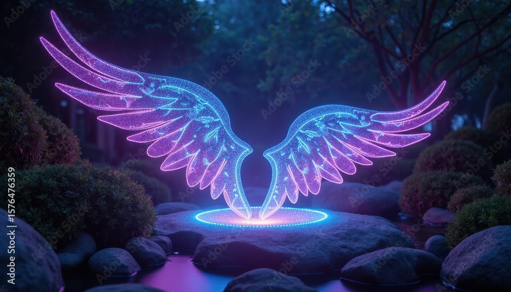 data stream shaped like angelic wings descending over a symbolic healing chamber bathed in bioluminescent colors. #1576476359