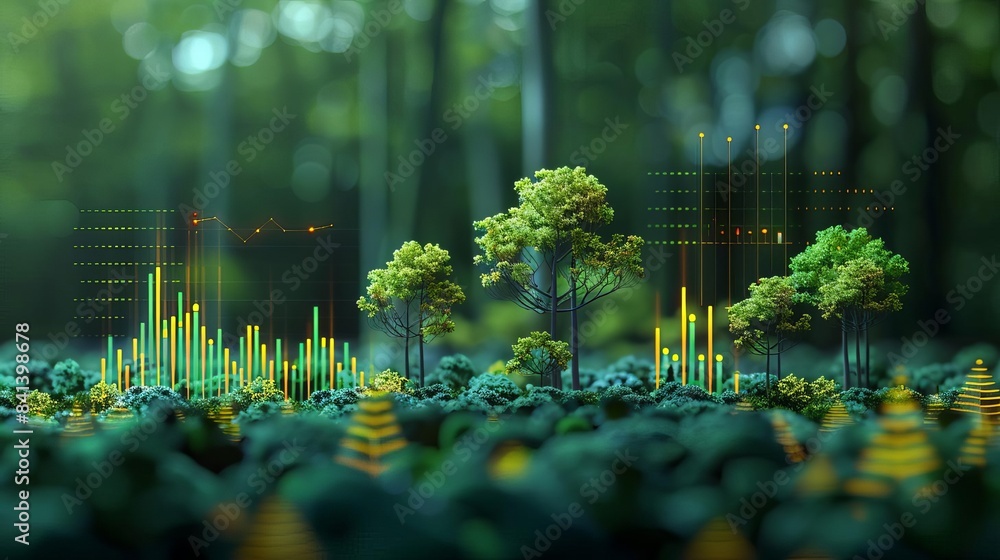 Data visualization on forest management and sustainability metrics, front view, highlighting the use of technology in conservation, technology tone, Complementary Color Scheme #841398678