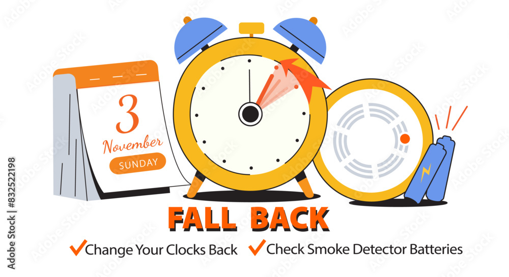 Daylight Saving Time Ends. Fall Back Time Banner. Clock with calendar date of changing time in November 3, 2024 with reminder text - Change Your Clock Back One Hour and Check Smoke Detector Batteries #832522198