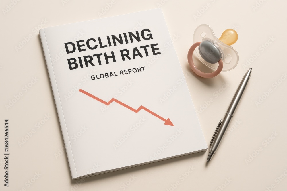 Declining global birth rate report with pacifier and pen on desk #1684266544