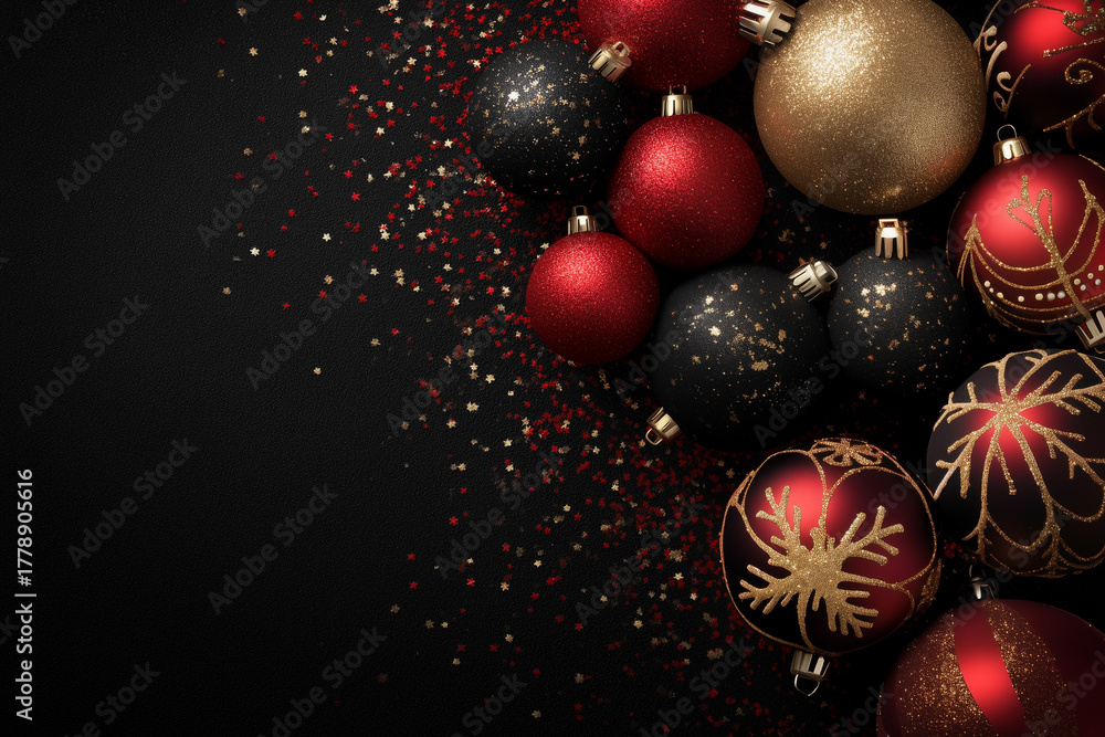 Decoración navideña contemporánea en rojo, negro y plata, evocando sofisticación, contraste visual y atmósfera festiva elegante.Ramas, esferas rojas y negras, copos dorados y bayas sobre fondo oscuro #1778905616