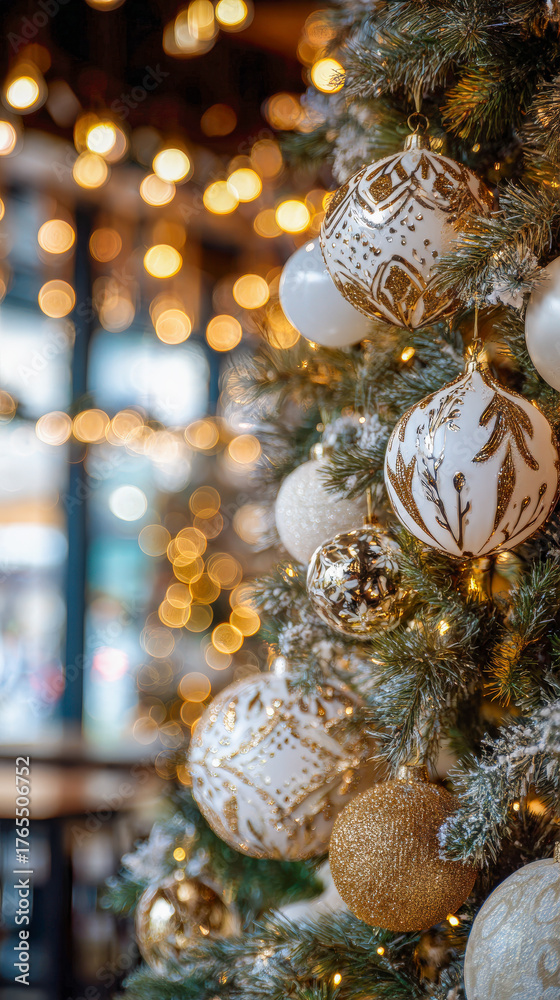Decoracion navideña de un arbol de navidad con bolas brillantes en tonos dorados, plteados y verdes sobre fondo desenfocado de un interior desenfocado con luces amarillas #1765506752