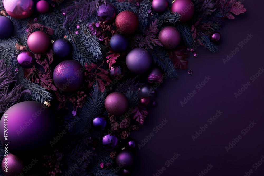 Decoración navideña elegante en púrpura y plata, evocando lujo moderno, atmósfera festiva y fantasía visual.Esferas púrpura y plateadas suspendidas sobre fondo bokeh violeta con estrellas y ornamentos #1778911941
