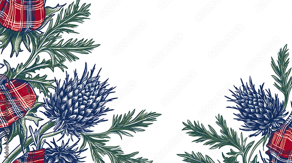 Decorative Floral Border Design with Red Plaid and Blue Thistle Elements on White Background #1288639785
