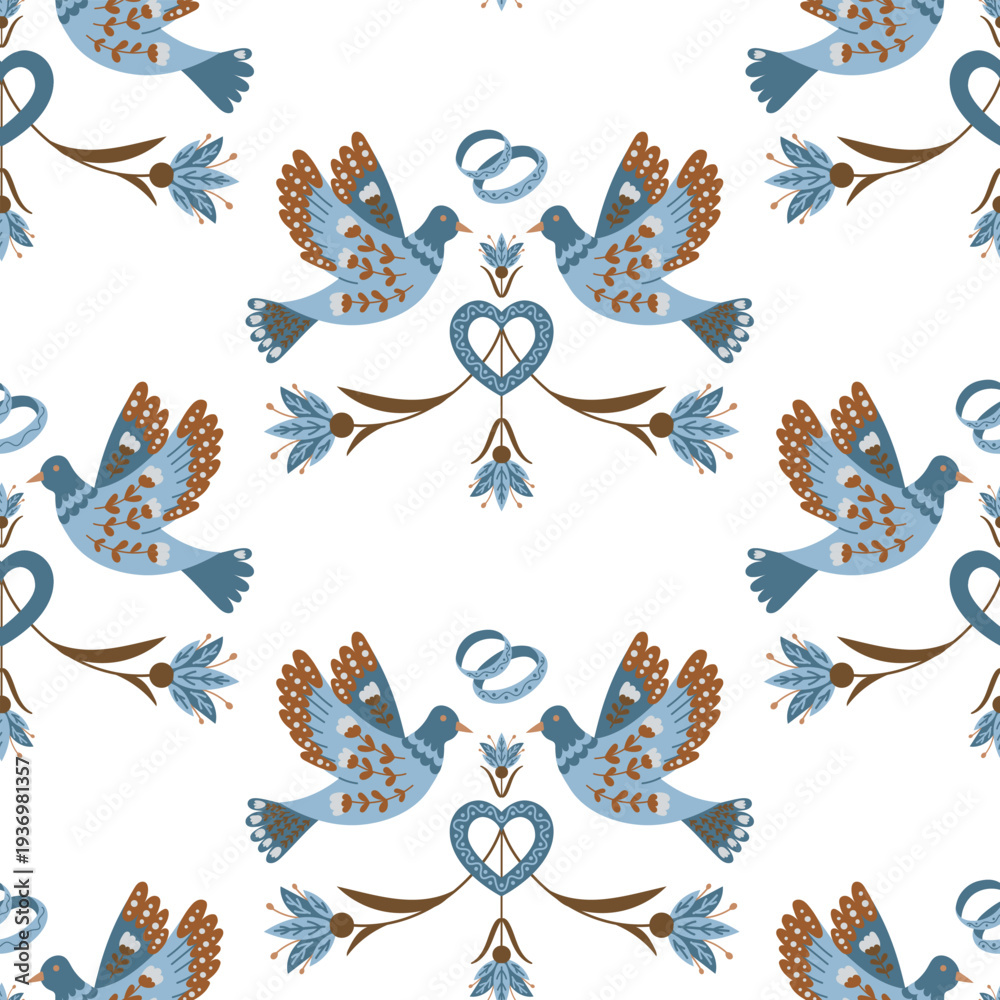 Decorative illustration featuring blue birds, floral elements, and wedding rings arranged in a symmetrical pattern on a white background #1936981357