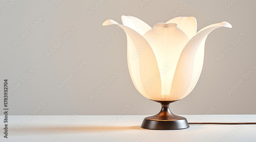Decorative table lamp with white flower shaped lampshade glowing softly on white surface against neutral background #1783932704