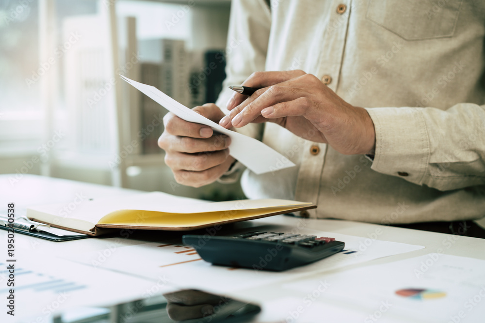 Deduction planning, debt asian accountant hand using calculator to calculating money balance from bill and income, cost budget expenses for pay money form personal individual on table at home. #1950240538