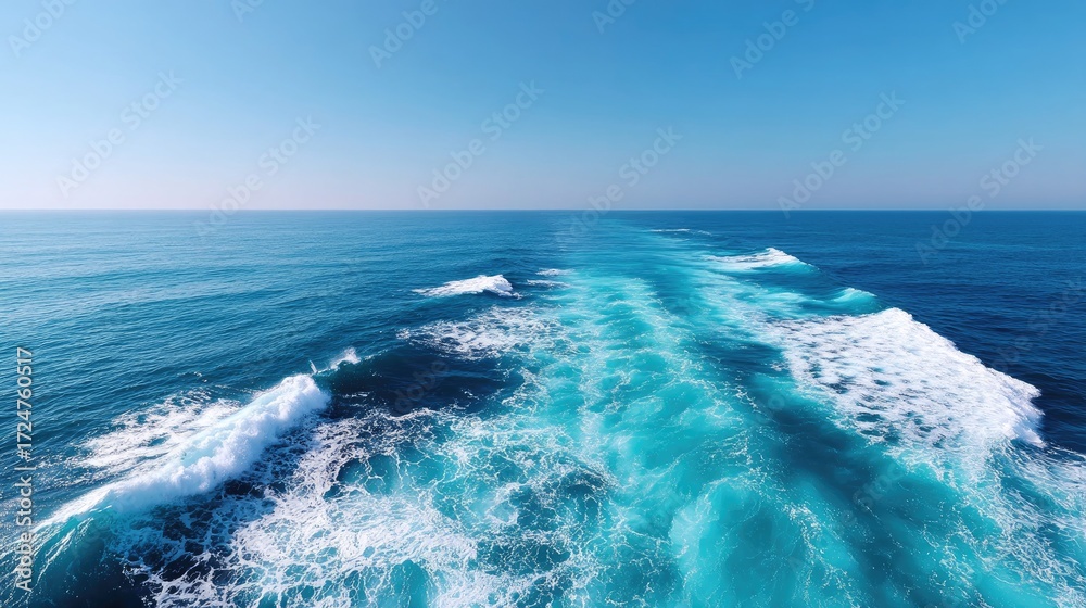 Deep Blue Ocean with Boat Wake Under Clear Sky on Sunny Day Ripples and Turquoise Hues Forming Dynamic Patterns Ideal for Travel Backgrounds #1724760517