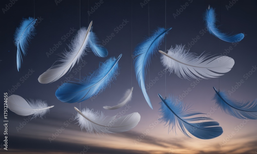 Delicate blue and white feathers float, suspended against a soft sunset sky #1751274055