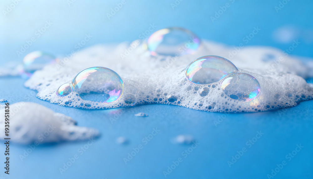 Delicate Floating Soap Bubbles and Foam on Clean Blue Surface #1935951836