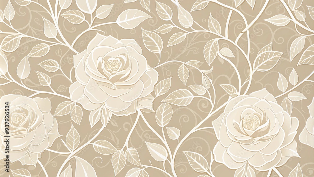 Delicate rose bloom outlined in thin white lines on a soft, creamy background, surrounded by a subtle repeating pattern of interlocking flowers and curving vines. #937926534