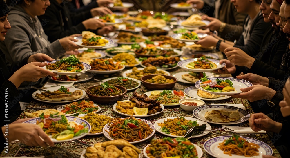 Delicious abundant festive food table middle eastern cuisine dishes meal home meat rice party feast #1315677905
