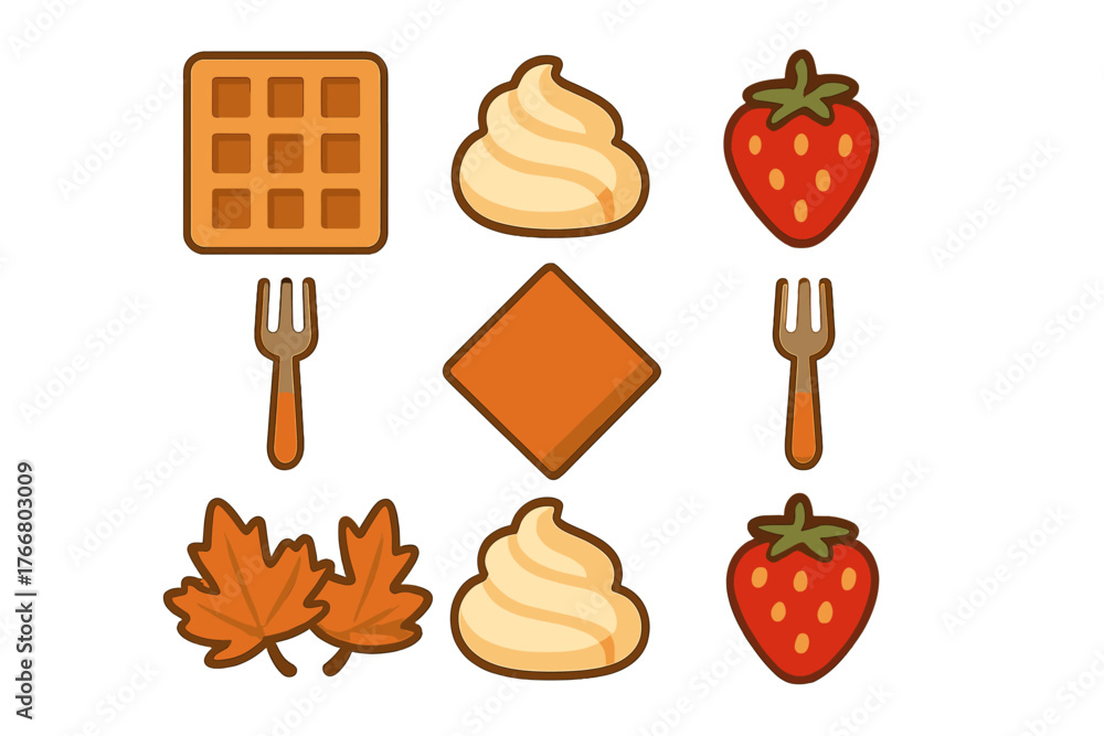 Delicious autumn breakfast featuring waffle, whipped cream, strawberries, and maple leaves #1766803009