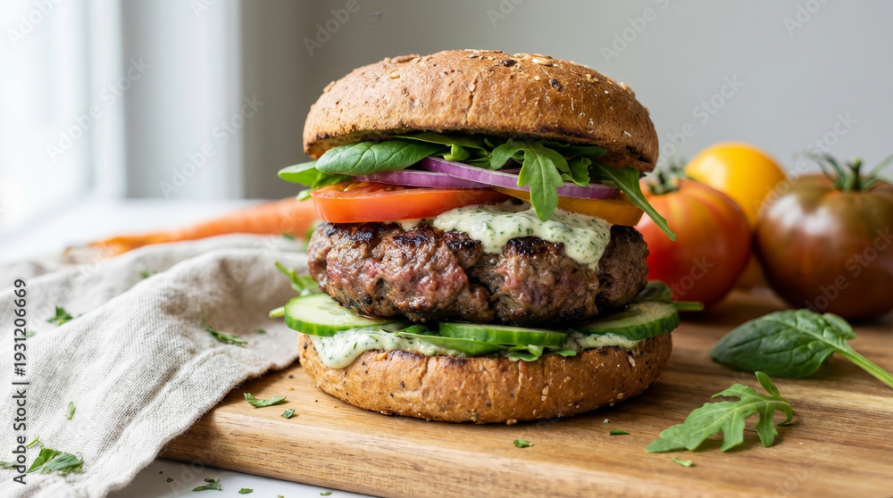 Delicious gourmet beef burger served on wooden cutting board with fresh vegetable ingredients like tomato and onion looks appetizing and tasty for healthy lunch meal or homemade dinner #1931206669